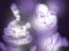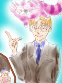 実は最初にいただいたのは、紫を基調とした下のイラストの方なのです。社さんとチェシャ猫の表情のシンクロ具合と言い、ちょっと怪しげな雰囲気と言い、大好きなのです……が。できればSSの挿絵としていただきたいと狙っていた私は、もう一枚明るい感じのイラストを!と更にPerorin様にお願いしてしまい(いい度胸ですよね)、そうしていただいたのが、上のコミカルタッチな一人と一匹です。